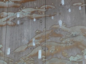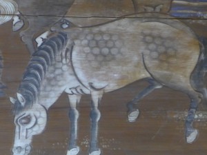 芦毛馬の銭形模様もしっかり残っています(画像クリックで拡大↓)。銭形模様周囲の微妙なグラデーションは、どんな技法で描かれたのでしょうか。