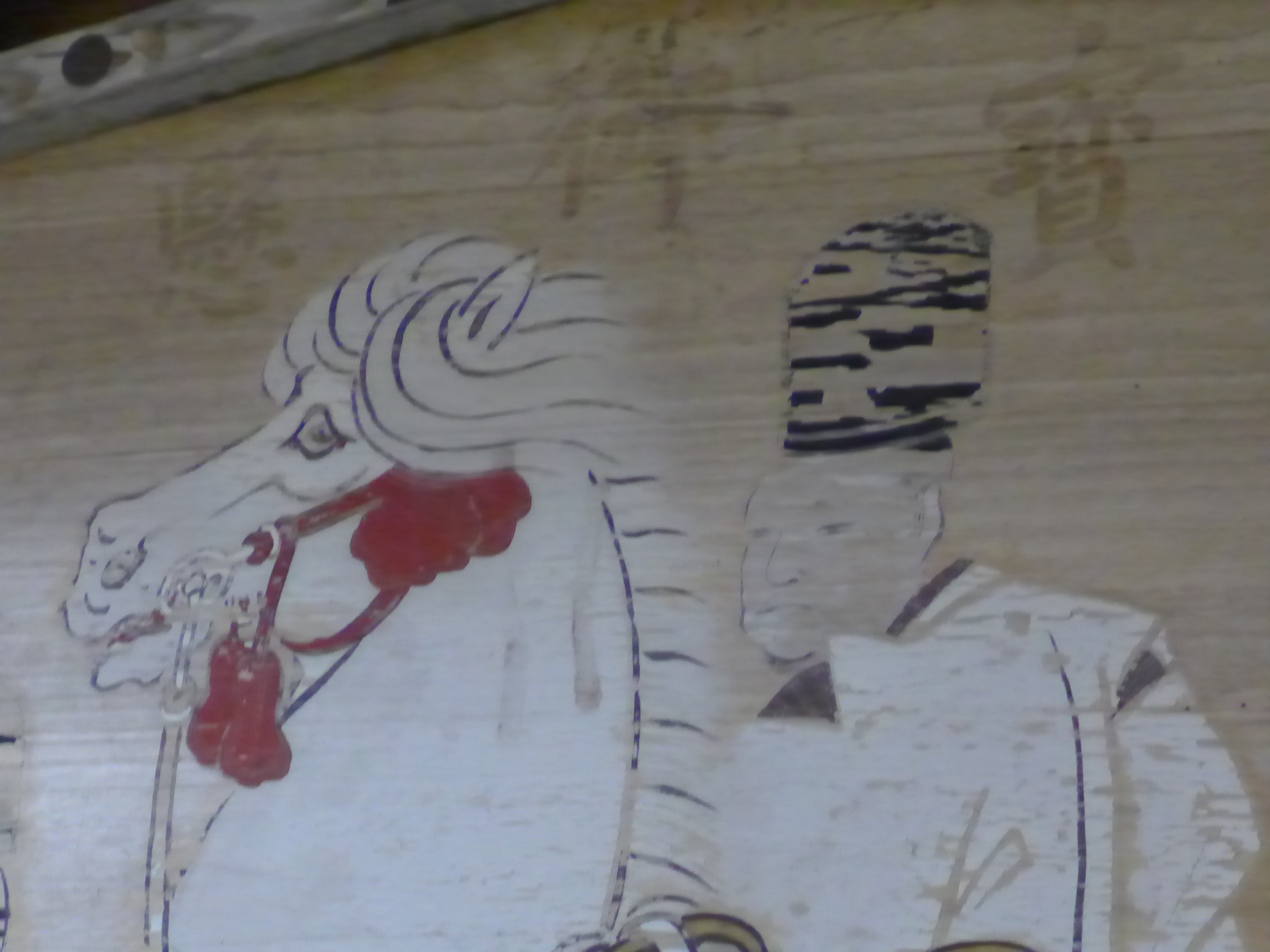 壁に多くの絵馬が奉掲されている当社では、朝の掃除の際、床に絵馬の彩色の一部が剥落していることがあり、本当に悲しい気持ちになるのですが、この絵馬だけはそれがありません。やはり、下地を塗らず絵馬板に直接描いてあるものは残りやすいですね。