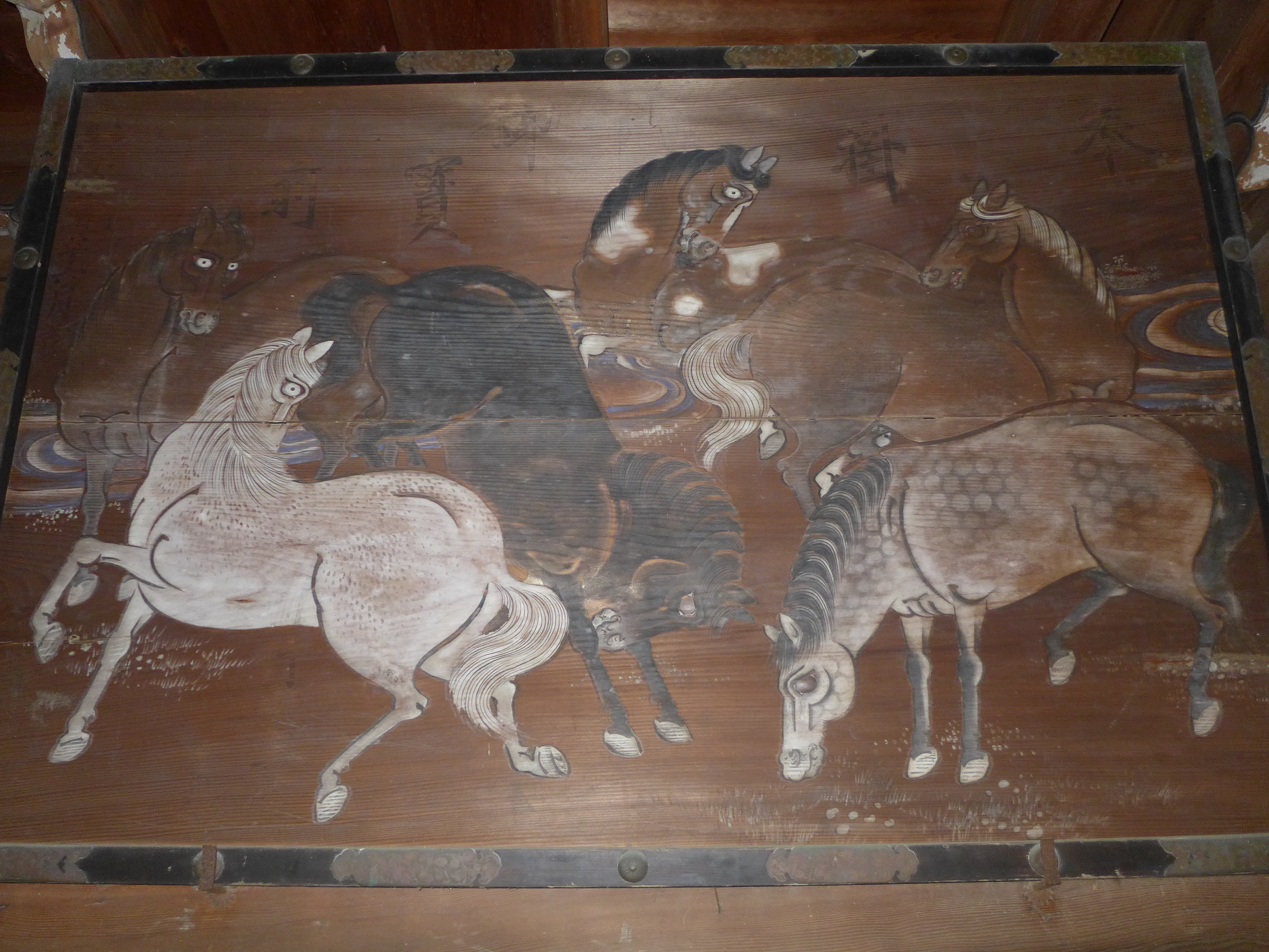 今回ご紹介する絵馬は、中殿に奉掲されております、竹中主膳重矩奉納の「六馬図」です。こちらも幅5尺半(約166cm)以上の大きなものです。