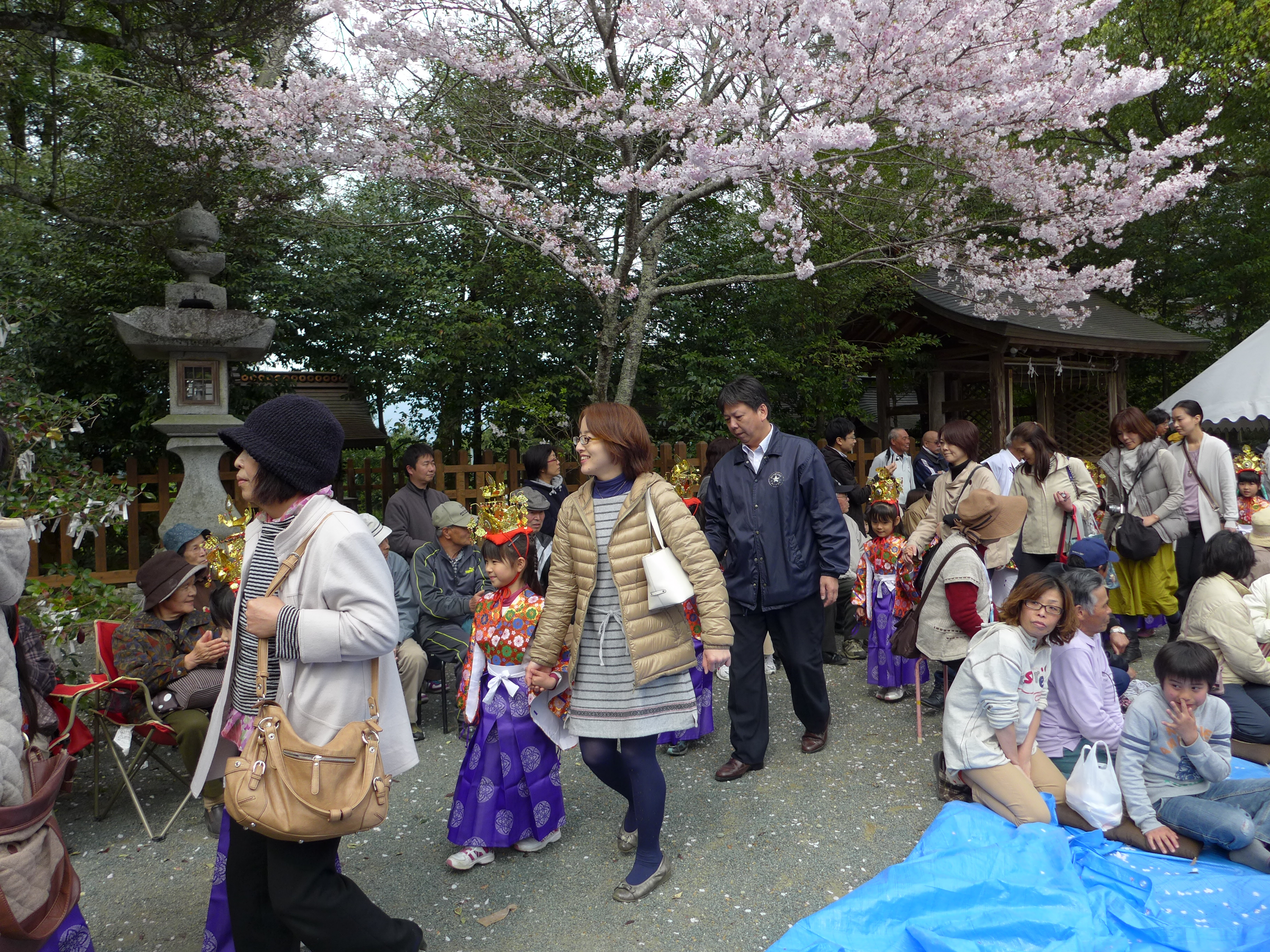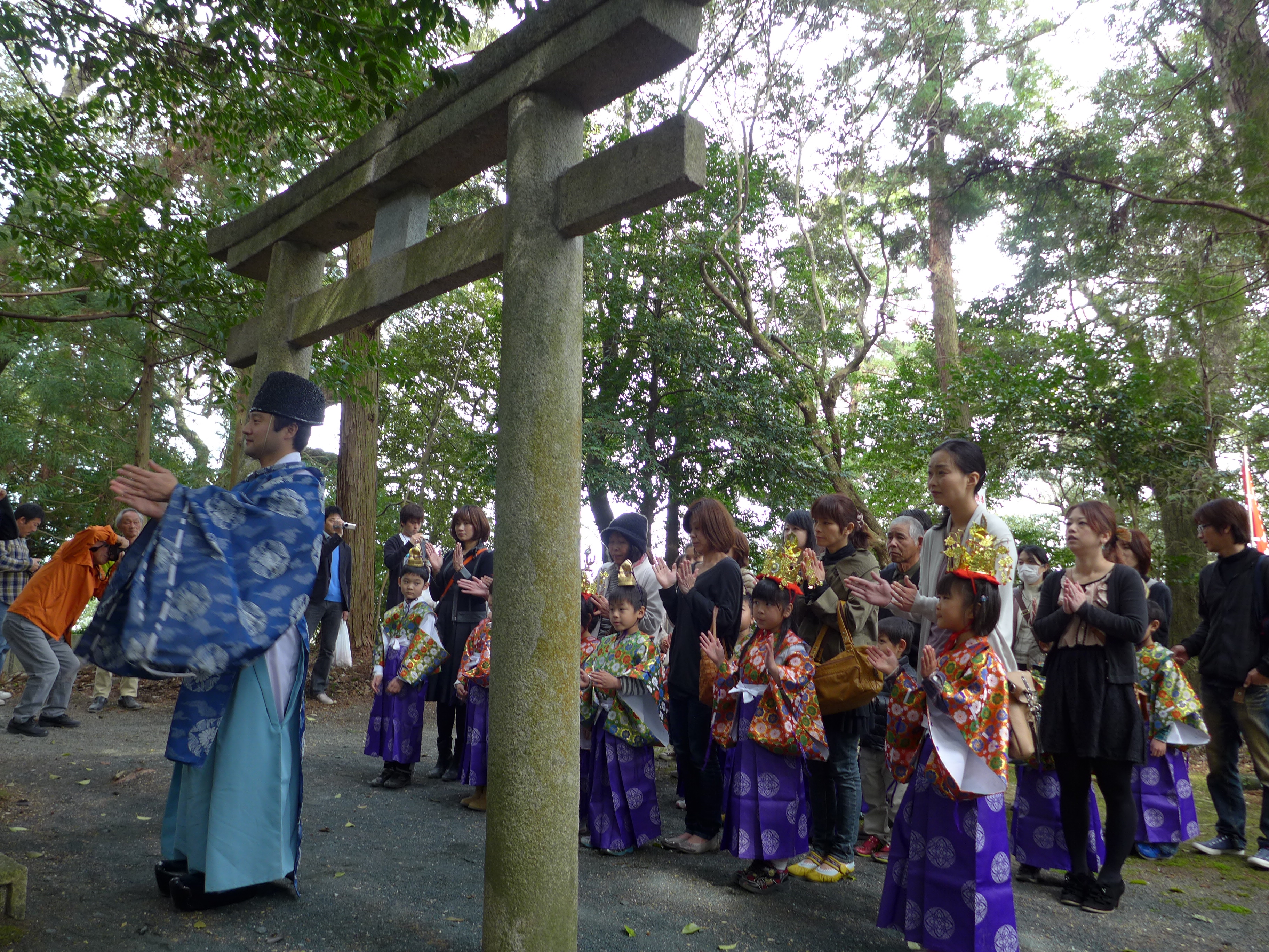 当日、子どもたちは稚児装束に着替え、神門から社殿へと入っていくのですが、子どもたちの入場を見ると、雅楽を見ていた大勢の人たちも向きを変え、大きな拍手で出迎えてくれます。