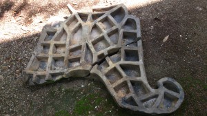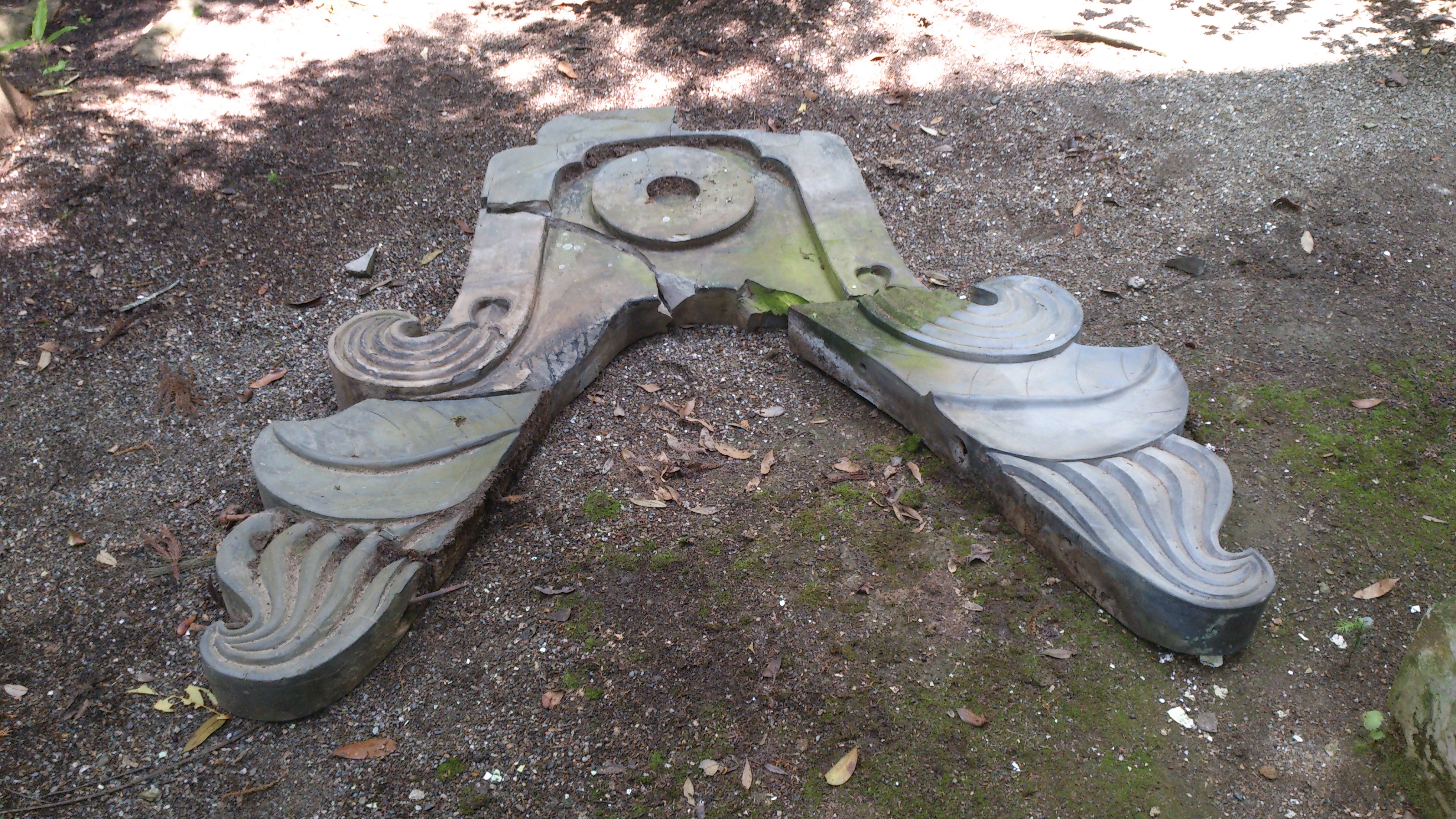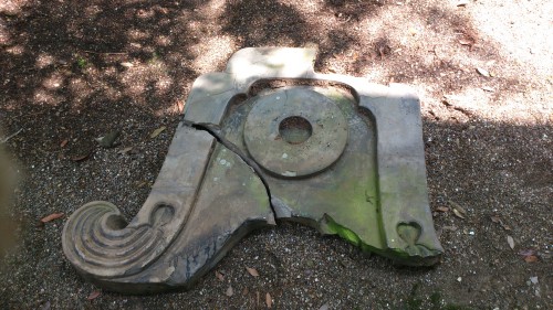 状態の良い鬼瓦は特別な場所に保存し、割れたり欠けてしまっているものは、とある場所の軒下に集めて保管しています。すべて捨てずに保管してあるので、きっと完全に近い形になるはず。というわけで、パズルのように合わせてみると・・・