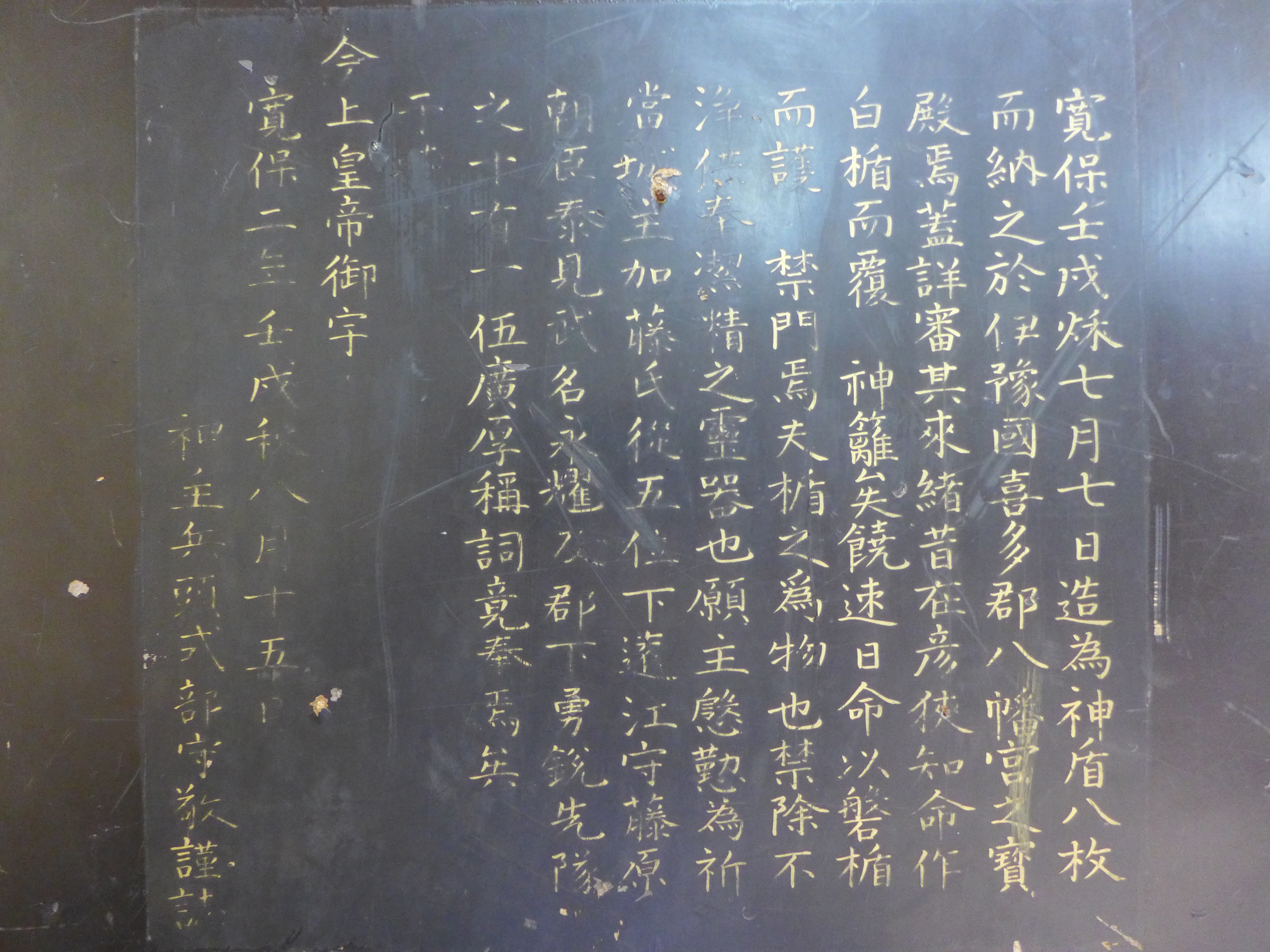 神盾の裏面には、寛保2年に大洲藩主によって奉納されたことが記されている