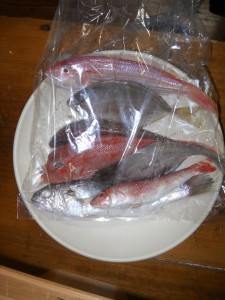 また、このお旅所神事では、鳳輦(御神輿)にお遷りになった大神様たちにお供え物をするのですが、そこで供える魚は江戸の昔から「七色の魚」と決まっています。なぜ七色なのかは不明で、魚の種類が決まっているわけでもありません。とにかくそれぞれ色の異なる魚を七匹(×3)ということなのです。しかし、色の異なる魚を七匹集めるのは至難の業。なるべく色が異なる魚を魚屋さんに用意をしてもらっています。魚をお願いするのは三の丸枡形の木戸岡鮮魚店さん。当社とはもう100年以上のお付き合いになります。