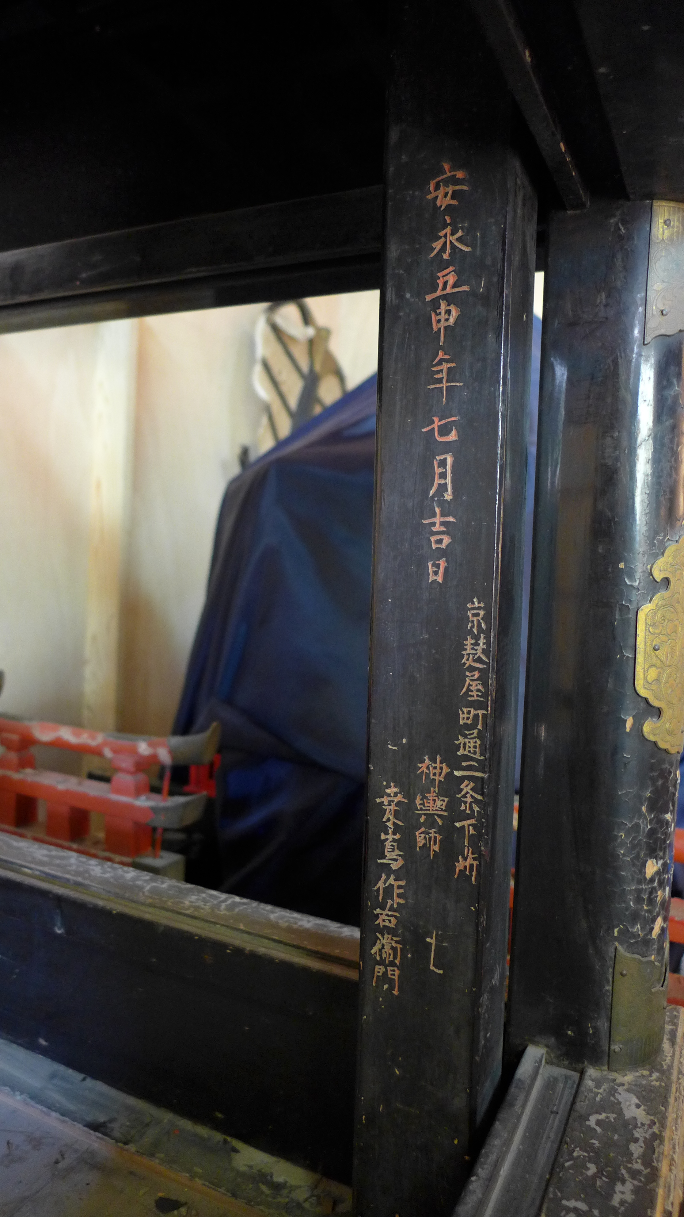 この御神輿は、安永5年(1777)の奉納。約240年前という古いもの。その後、天保、大正と修理をされており、今回は実に95年ぶりの修理となります。