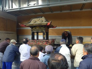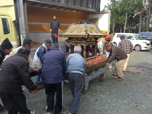 今回、3基中1基をなんとか修理できることになり、総代さんたちにお手伝いいただいてトラックにと積み込みました。この後、京都で職人さんたちの手によって修理され、来年の秋に帰ってくる予定です。