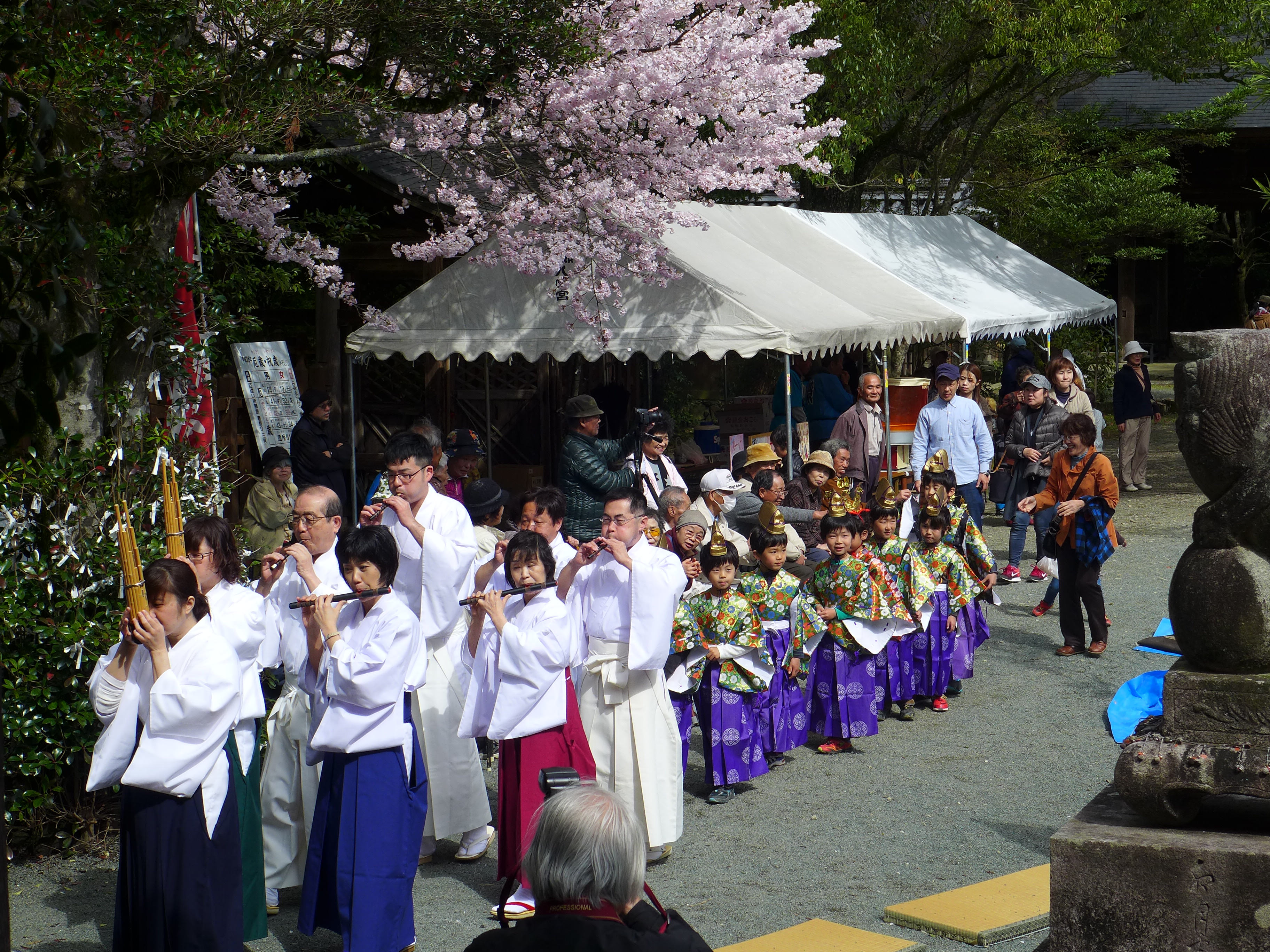 勧学祭では、門から社殿まで稚児衣装に身を包んだ子どもたちが皆さんの拍手の中、入っていくのですが、今年は、大洲雅楽同好会の皆さんが雅楽を演奏しながら先導してくださいました。とても評判が良かったので来年以降も続けたいと思います。