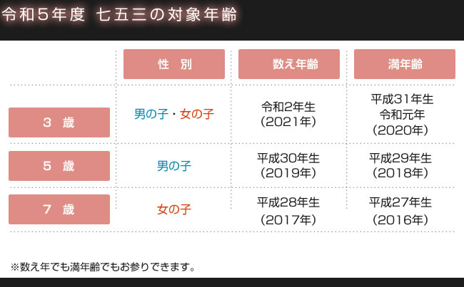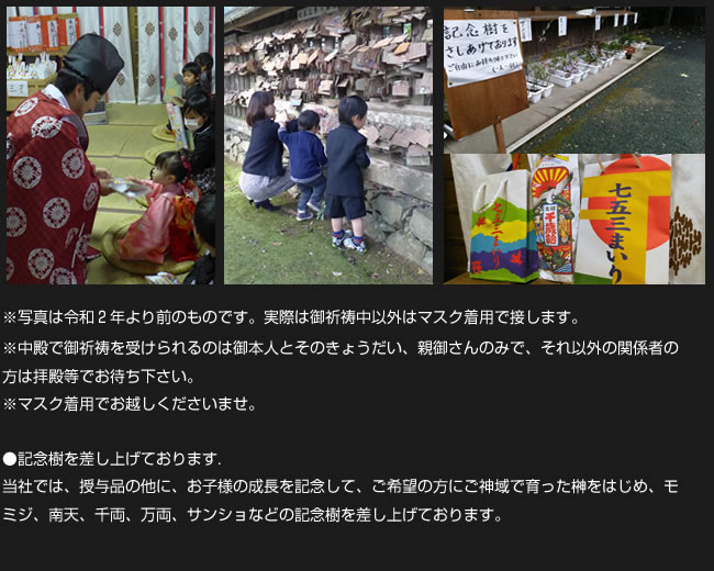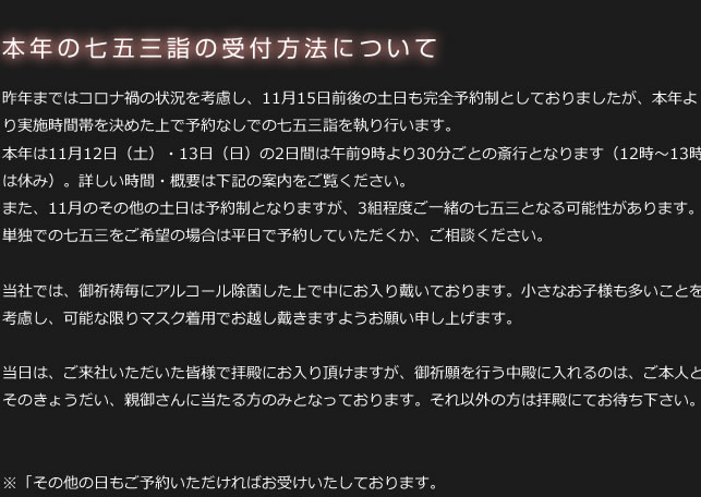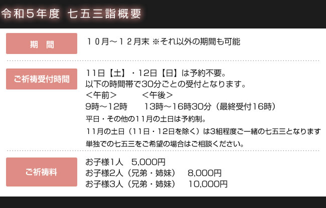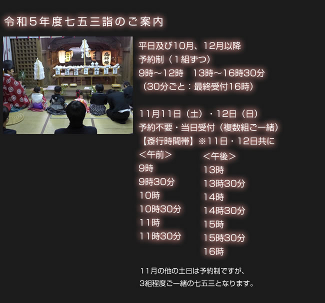 七五三詣は、子どもの健やかな成長と健康を氏神様に感謝するとともに、今後の健やかな成長を祈願する儀式です。 そのいわれは、三歳の男女児がこれまで剃ってきた髪を伸ばし始める「髪置(かみおき)」、五歳男児が初めて袴をはく「袴着(はかまぎ)」、7歳の女児が初めて大人と同じ帯をしめる「おびと帯解き(紐解き)」の祝いにあり、平安時代から行われてきました。 当社では、ご予約頂ければいつでも七五三の御祈祷を行うことができます (御祈祷は1組ずつ行います)。