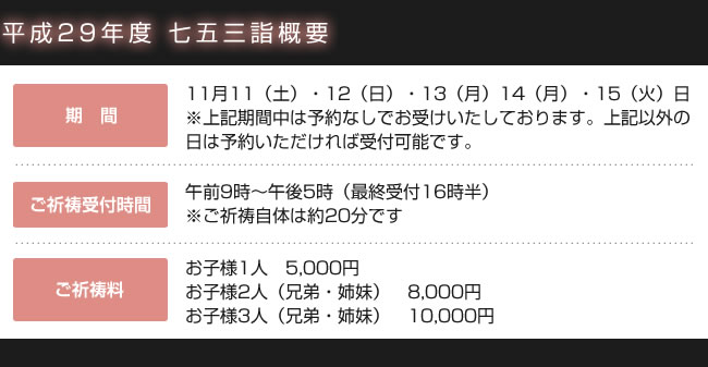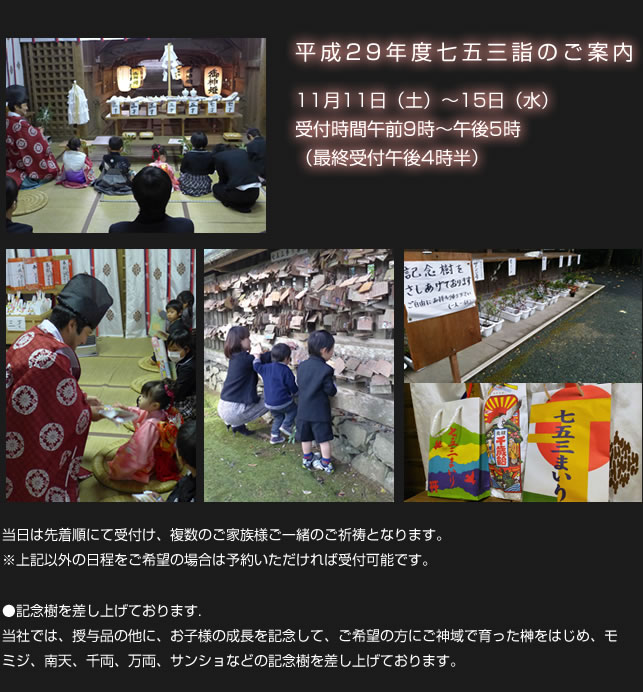 七五三詣は、子どもの健やかな成長と健康を氏神様に感謝するとともに、今後の健やかな成長を祈願する儀式です。 そのいわれは、三歳の男女児がこれまで剃ってきた髪を伸ばし始める「髪置(かみおき)」、、五歳男児が初めて袴をはく「袴着(はかまぎ)」、7歳の女児が初めて大人と同じ帯をしめる「おびと帯解き(紐解き)」の祝いにあり、平安時代から行われてきました。 八幡神社では、11月11〜15日の5日間、予約なしでの七五三詣を執り行います。ご家族皆様でお参りください。