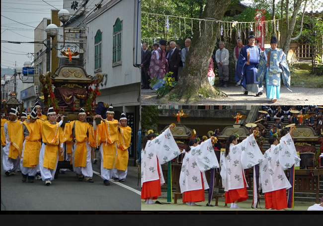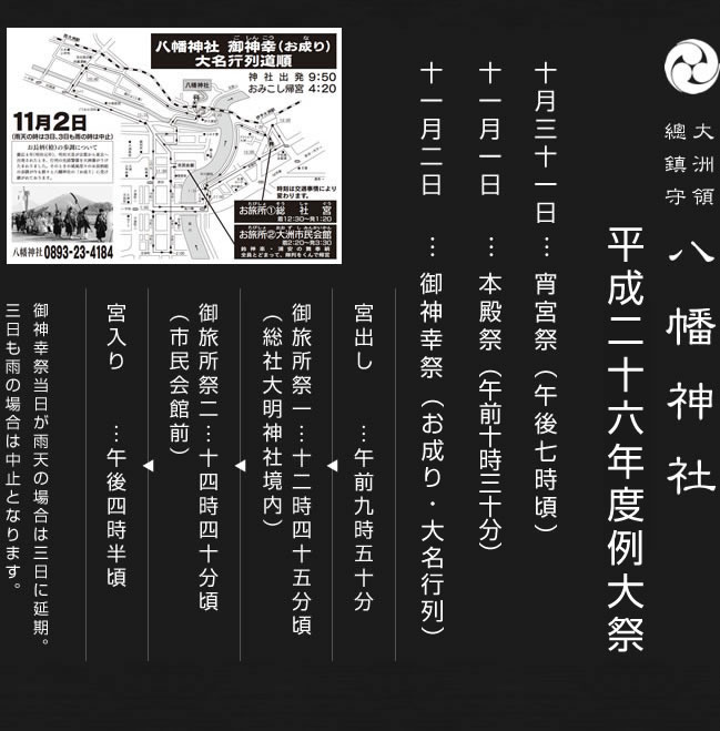八幡神社の御神幸祭は、神社にとって最も大切な例祭(11月1日)の翌日、11月2日に行われます。 御神幸祭は、地元では「八幡宮のお成り」として親しまれ、御祭神にお遷りいただいた3基の鳳輦(御神輿)を中心に、そのお供である約260名が時代衣装に身を包み、大洲市街約12kmを巡幸するものです。 鳳輦(神輿)を護るお長柄組は、かつては大洲藩士が奉仕しました。その歩調は独特で、大洲藩の参勤交代の時の歩調といわれています。現代のお長柄組にもその独特の歩調が受け継がれています。